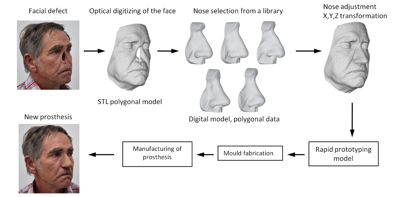 3D digitalizace a rapid prototyping technologie nachází své uplatnění v různých oblastech průmyslu, vědy a výzkumu. Výjimkou není ani oblast protetických a ortotických pomůcek, které jsou v optimálním případě unikátním produktem uzpůsobeným pro potřeby konkrétního jedince. Digitální technologie umožňují zrychlit a zpřesnit výrobu těchto pomůcek. Zvláště náhrady obličejových částí jako jsou uši a nos mohou být digitální cestou realizovány efektivně. Cílem projektu bylo zavést 3D digitalizaci a aditivní výrobu do běžné výrobní praxe ve specializované firmě.